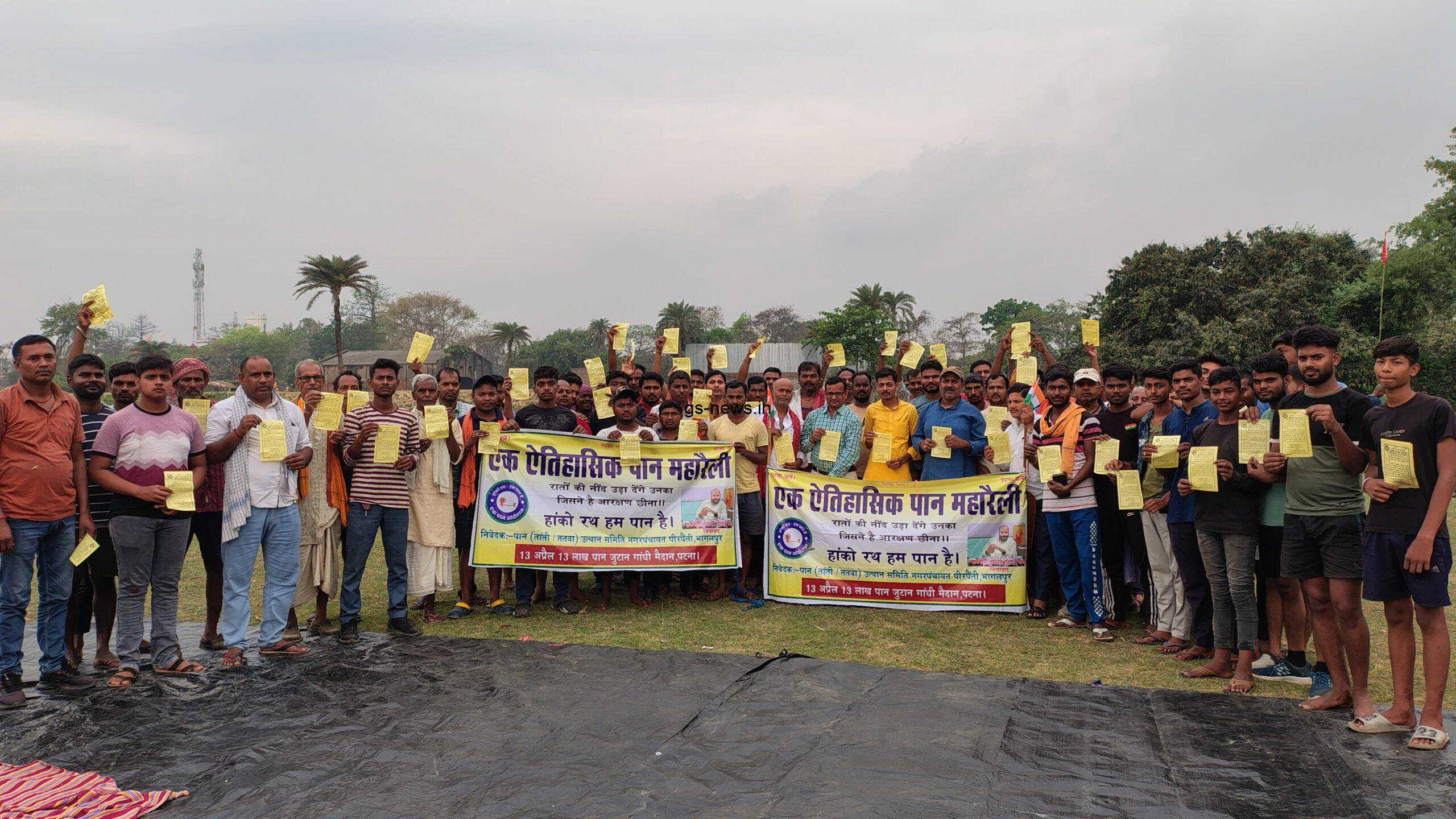 जिससे हमारे समाज को आरक्षण का लाभ नहीं मिल सकेगा, जिसके खिलाफ पान समाज एक जुट हो रहा हैं, वही इस अवसर पर अध्यक्ष कैलाश तांती, उपाध्यक्ष गुड्डू तांती, सचिव सूरज कुमार, सीपीआई नेता प्रदीप तांती, शिक्षक राकेश कुमार तांती, समाजसेवी ज्ञानदेव तांती, प्रवीण कुमार तांती, सेवक कुमार पान, रितेश कुमार पान, हरिचरण पान, रंजीत कुमार पान, रामविलास तांती, मनीष कुमार पान, अजय पान, निरंजन पान अमरदीप कुमार तांती सहित सैकड़ों पान तांती समाज के लोग उपस्थित रहे।