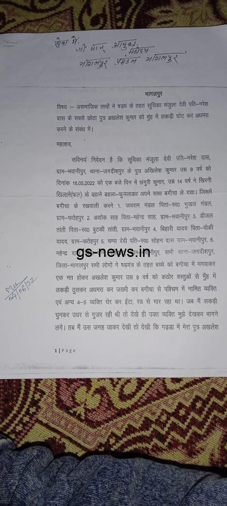 भागलपुर| जगदीशपुर थाना क्षेत्र के फतेहपुर के समीप सोलह मई को भवानीपुर निवासी नरेश दास के नौ वर्षीय पुत्र अखिलेश कुमार को ईट से कुचल कर उनकी निर्मम तरीके से हत्या कर दी गई थी, घटना के करीब चार दिन बाद मृतक की मां मंजुला देवी द्वारा जगदीशपुर थाना में आवेदन देकर भवानीपुर देसरी पंचायत के पूर्व मुखिया अशोक शाह, वर्तमान सरपंच बिहारी यादव, फतेहपुर गांव निवासी जयराम मंडल, भवानीपुर निवासी डीजल ताती, महेंद्र दास, चंपा देवी समेत एक दर्जन अन्य अज्ञात लोगों के खिलाफ प्राथमिकी दर्ज कराई थी, आवेदन में मृतक के मा ने बतायी है.