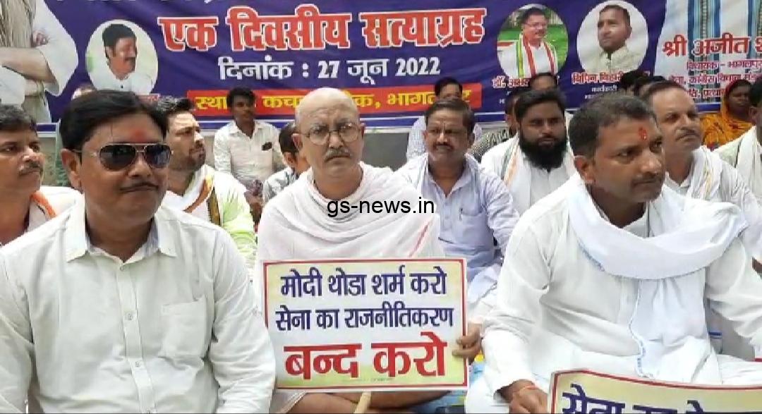भागलपुर।अग्नीपथ योजना के खिलाफ जिला कांग्रेस कमेटी भागलपुर का एकदिवसीय सत्याग्रह आज पूरे बिहार में चल रहा है। उसी बाबत आज भागलपुर समाहरणालय परिसर के पास भागलपुर कांग्रेस कार्यकर्ताओं ने एकदिवसीय सत्याग्रह का कार्यक्रम रखा, जिसमें दर्जनों कांग्रेसी कार्यकर्ता व अधिकारी वर्तमान सरकार के खिलाफ नारेबाजी करते दिखे।
