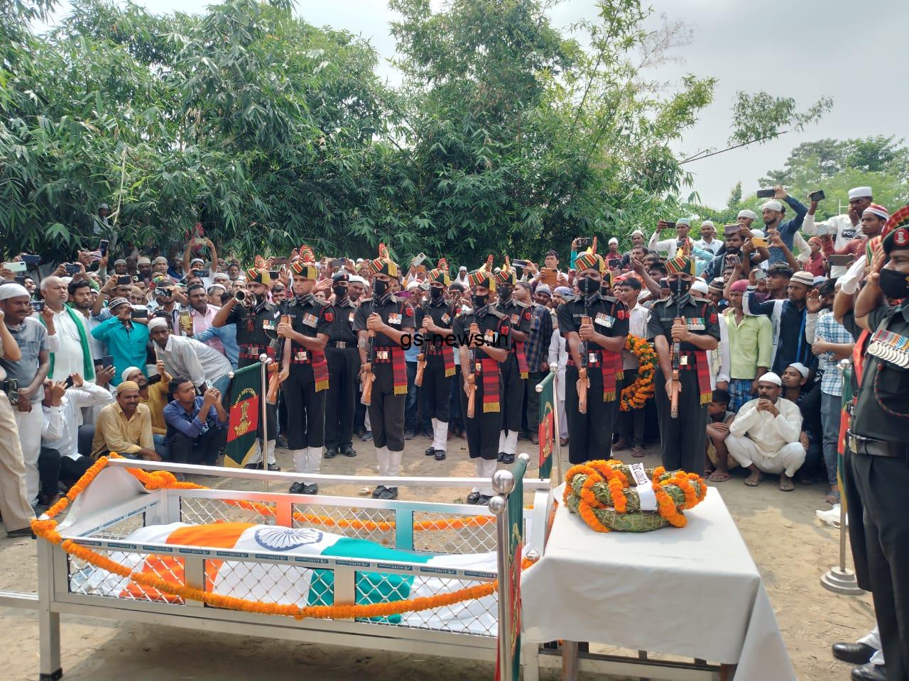 गुरुवार को सुबह 9बजे बिहार रेजीमेंट सेंटर दानापुर से आये सेना के सात जवानों ने हवाई फायरिंग के सलामी दिया.वहीं बिहपुर थानाध्यक्ष राजकुमार सिंह और एएसआई सतेंद्र सिंह ने भी दिवंगत जवान को सलामी दिया.जवान अपने पीछे पत्नी शाइस्ता खातून व तीन की बच्ची आरिफा खातून को छोड़ गये. जवान की अंतिम यात्रा में जिप मोइन राइन , भाजयुमो के नेता रुपेश कुमार रुप,उपप्रमुख एनामूल, सरपंच मोहम्मद असदुद्दीन ,मुखिया गुलजार खान ,कमरूजमा अंसारी ,पंसस प्रतिनिधि कबीर राइन समेत इलाके के बड़ी संख्या में लोग शामिल हुये.
