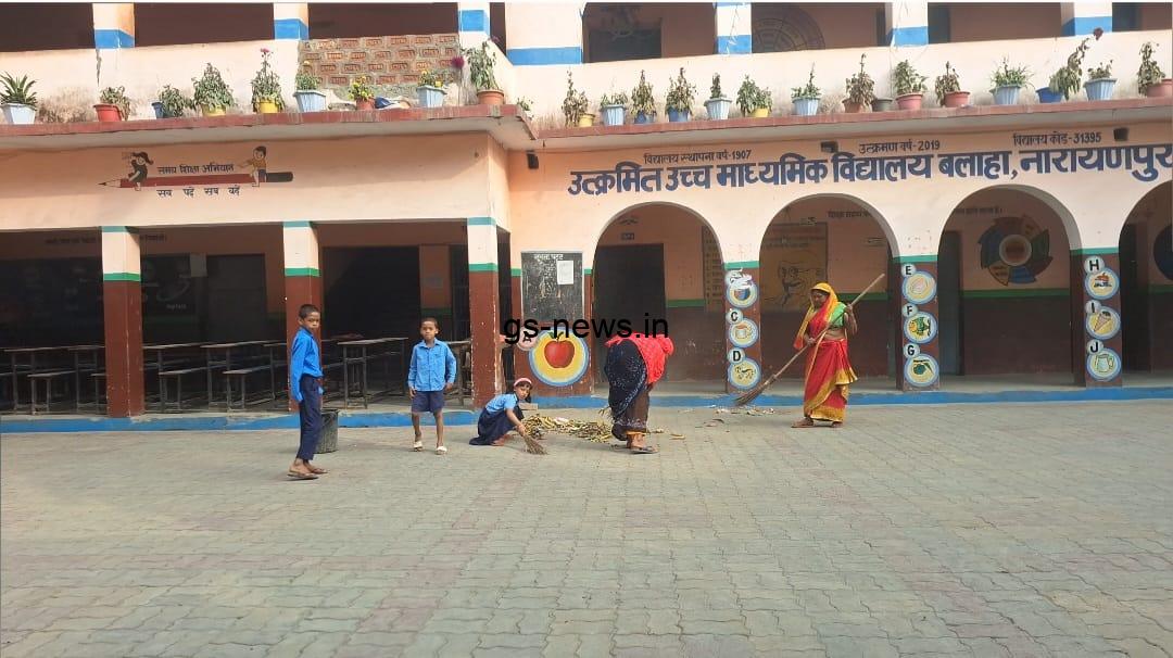नारायणपुर। क्षेत्र के उत्क्रमित उच्च माध्यमिक विद्यालय बलाहा में एक छात्रा द्वारा विद्यालय परिसर में झाड़ू लगाने का मामला सामने आया है। यह घटना शनिवार की बताई जा रही है, जिसका दृश्य कैमरे में भी कैद हो गया है। इस मामले की शिकायत विद्यालय के प्रधानाध्यापक विनोद मंडल से की गई है।