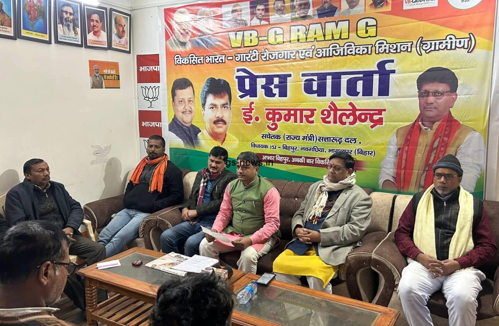 भागलपुर। बिहपुर एनडीए कार्यालय में रविवार को भाजपा नेताओं ने विकसित भारत रोजगार आजीविका मिशन (भीबी जी राम जी) को लेकर प्रेसवार्ता की। इस अवसर पर बिहपुर विधानसभा के भाजपा विधायक ई० शैलेंद्र भी मौजूद रहे।