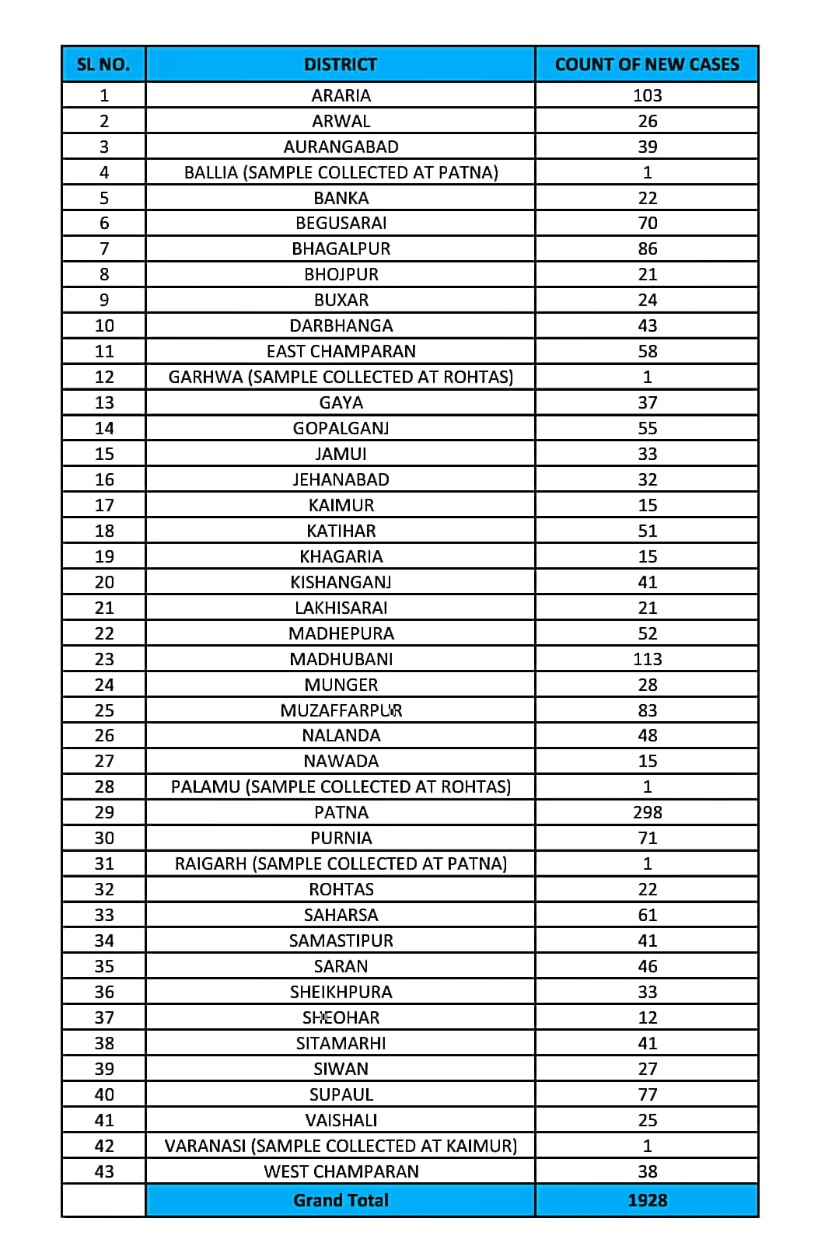 मंगलवार को जारी ताजा अपडेट के मुताबिक बिहार के विभिन्न जिलों से 1928 नए मामले सामने आये हैं. इसके साथ ही राज्य में कोरोना मरीजों का आंकड़ा 138265 हो गया है. बीते दिन सोमवार को जारी नियमित अपडेट के मुताबिक 24 घंटे के भीतर 6 लोगों की मौत हुई. इसके साथ ही राज्य में कोरोना से मरने वालों की संख्या बढ़कर 694 हो गई है.