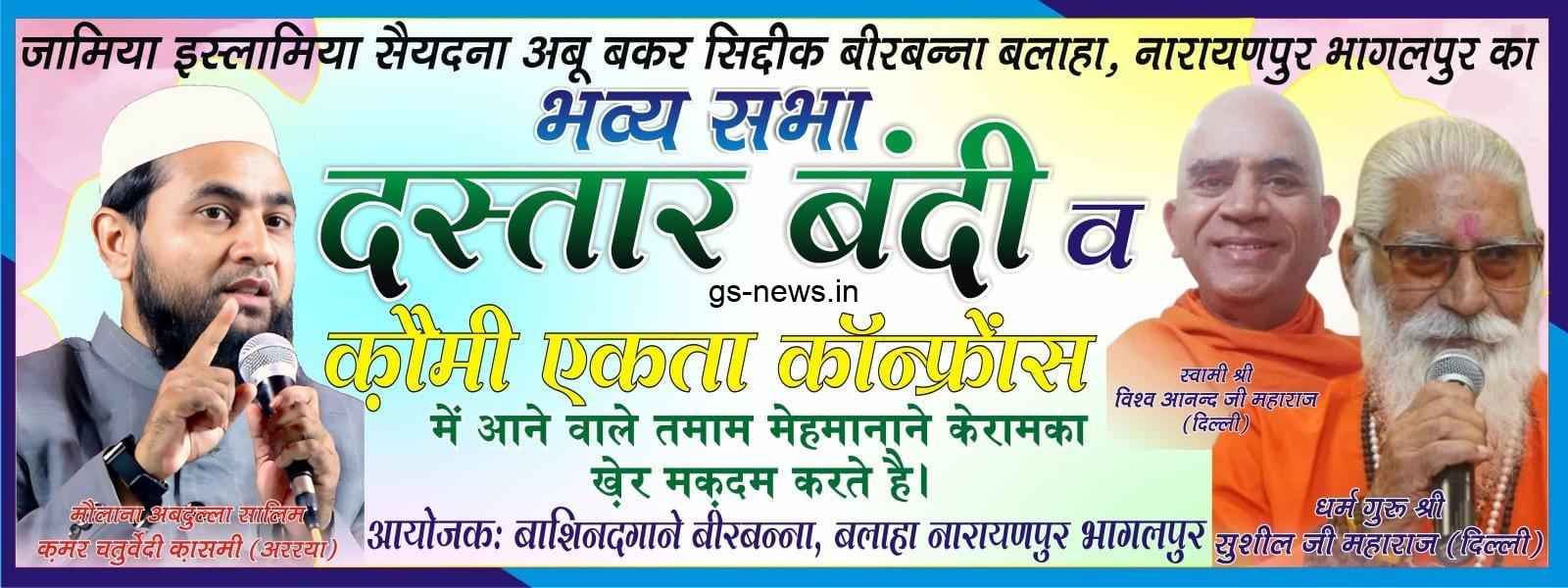 नारायणपुर प्रखंड के जामिया इस्लामिया सैयदना अबु-बकर सिद्दीक, बिरबन्ना (बलाहा) में आज 22 जून को संध्या 6 बजे दस्तारबंदी एवं कौमी एकता का भव्य सभा आयोजित किया जा रहा है। इस आयोजन के माध्यम से सामाजिक सौहार्द और भाईचारे का संदेश पूरे क्षेत्र में फैलाया जाएगा।