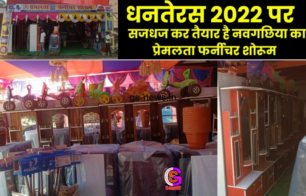 धनतेरस 2022 पर नवगछिया आदर्श थाना चौक सत्संग मंदिर के सामने स्थित प्रेमलता फर्नीचर धनतेरस के शुभ अवसर पर सजधज कर तैयार है . जहां फर्नीचर एवं फर्निशिंग के सभी सामान उपलब्ध है । मौके पर संचालक प्रशांत कुमार ने बताया कि धनतेरस के अवसर पर प्रेमलता फर्नीचर शोरूम में हर खरीदारी पर निश्चित उपहार दिया जा रहा है । धनतेरस के अवसर पर 30% तक की भारी छूट है । मौके पर संचालक अंकित कुमार ने बताया कि प्रेमलता फर्नीचर में त्रिवेणी बजाज सेलो वर्लपूल सहित दर्जनों कंपनी के विभिन्न आइटम उपलब्ध हैं । शोरूम में सोफा, पलंग (शीशम सागवान एवं स्टील) गद्दा, अलमीरा, ड्रेसिंग टेबल, ऑफिस टेबल, डाइनिंग टेबल, कुर्सी, घड़ी,वाशिंग मशीन, फ्रिज, मिक्सी, इंडक्शन चूल्हा, रूम हीटर,डिनर सेट,शर्बत सेट, कप, ग्लास, प्लेट, झूला,बच्चों का गाड़ी इत्यादि काफी सस्ती कीमत पर उपलब्ध हैं । धनतेरस पर विभिन्न प्रकार के उपहार दिए जा रहे हैं जिनमें 5000 से ₹10000 की खरीदारी पर 6 पीस का कप सेट दिया जा रहा है । 15001 से ₹50000 तक की खरीदारी पर आयरन एवं वाटर हीटर उपहार में दिया जा रहा है । इसके अलावा 50001 से 100000 की खरीदारी पर चांदी का सिक्का एवं डिनर सेट उपहार में दिया जा रहा है। वही 1,00,001 से ₹1,50,000 तक की खरीदारी पर मिक्सर ग्राइंडर गिफ्ट में दिया जा रहा है । ₹150001 से ₹200000 की खरीदारी पर इंडक्शन चूल्हा एवं ₹2,00,001 से ₹3,00,000 की खरीदारी पर एक गीजर उपहार में दिया जा रहा है । यह ऑफर 21 अक्टूबर 2022 से 31 अक्टूबर 2022 तक मान्य है प्रेमलता फर्नीचर में खरीदारी पर हर खरीदारी पर एक उपहार सुनिश्चित है वही इस बाबत प्रेमलता फर्नीचर के शोरूम नंबर 8709594413,7903710694 पर सम्पर्क कर सकतें हैं ।