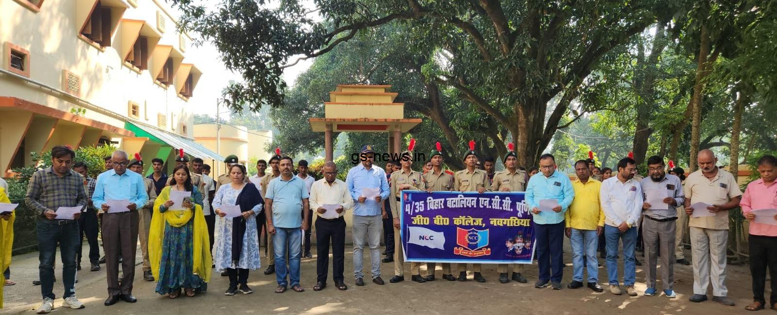 नवगछिया, 07 नवम्बर 2025। जी बी कॉलेज, नवगछिया में आज राष्ट्रीय गीत ‘वंदे मातरम्’ के 150 वर्ष पूर्ण होने के अवसर पर विशेष कार्यक्रम का आयोजन किया गया। प्रातः 10 बजे प्राचार्य डॉ. सत्येन्द्र कुमार के नेतृत्व में शिक्षकों, शिक्षकेत्तर कर्मचारियों, छात्रों और एनसीसी कैडेटों ने सामूहिक रूप से वंदे मातरम् का गायन किया।