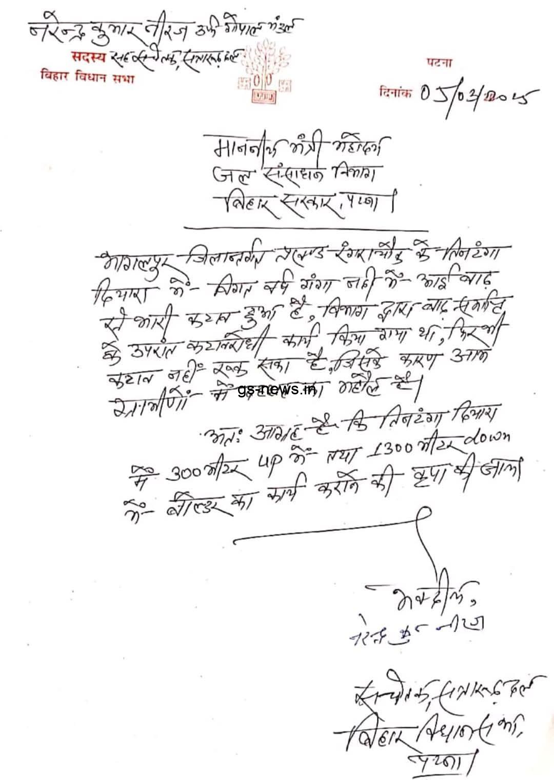 नवगछिया के गोपालपुर विधानसभा के विधायक गोपाल मंडल ने जल संसाधन विभाग के मंत्री को पत्र लिखकर रंगरा थाना के तिनटंगा दियारा में बोल्डर पिचिंग कार्य करवाने की मांग की है। उन्होंने बताया कि रंगरा चौके प्रखंड के तिनटंगा दियारा में पिछले साल गंगा नदी में आई बाढ़ के कारण भारी कटाव हुआ था। विभाग द्वारा बाढ़ समाप्ति के बाद कटावरोधी कार्य किए गए थे, लेकिन कटाव रुकने का नाम नहीं ले रहा है, जिससे स्थानीय ग्रामीणों में दहशत का माहौल बना हुआ है।