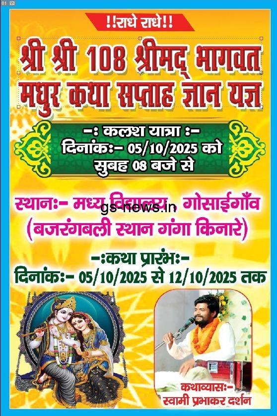 नवगछिया। गोपालपुर प्रखंड के गोसाईगाँव स्थित मध्य विद्यालय प्रांगण (बजरंगबली स्थान, गंगा किनारे) में श्री श्री 108 श्रीमद्भागवत मधुर कथा सप्ताह ज्ञान यज्ञ का आयोजन किया जा रहा है। यह धार्मिक अनुष्ठान 5 अक्टूबर 2025 से 12 अक्टूबर 2025 तक चलेगा।