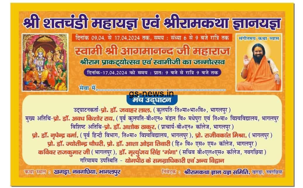 यहां स्वामी आगमानंद का प्रतिदिन प्रवचन होगा. यज्ञ और वर्ष प्रतिपदा समारोह का उद्घाटन स्वामी आगमानंद जी के अलावा तिमांविवि के कुलपति प्रो. जवाहर लाल, पूर्व कुलपति प्रो. अवध किशोर राय, बीएन कालेज के प्राचार्य प्रो. अशोक कुमार, प्रो. नृपेन्द्र वर्मा, राजीव कांत मिश्रा, प्रो. ज्योतिद्र प्रसाद चौधरी, डा. आशा तिवारी ओझा, गीतकार राजकुमार, डा. मृत्युंजय सिंह गंगा करेंगे. यज्ञ के अंतिम दिन रामनवमी 17 अप्रैल को भगवान राम और स्वामी आगमानंद महाराज का एक साथ तेतरी यज्ञ स्थल पर बने पंडाल में अवतरण दिवस मनाया जाएगा. स्वामी आगमानंद जी का जन्म रामनवमी के दिन हुआ है. उनका नाम रामचंद्र पांडेय रसिक है.