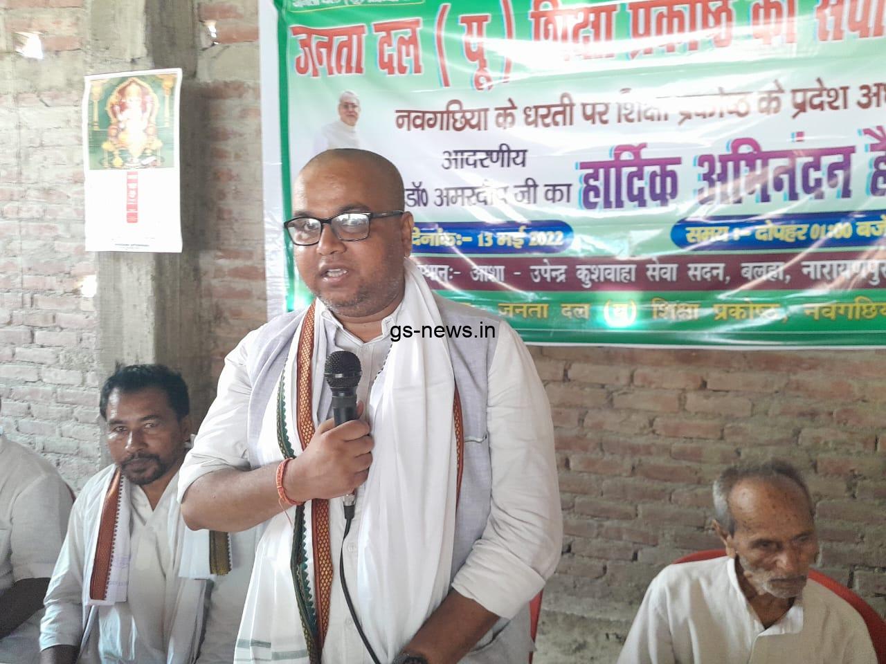 जनता दल यूनाइटेड शिक्षा प्रकोष्ठ के बिहार के प्रदेश अध्यक्ष डॉ अमरदीप संवाद यात्रा के दौरान नवगछिया पहुंचे. नारायणपुर के बलहा में आशा-उपेंद्र कुशवाहा सेवा सदन में जदयू जिलाध्यक्ष वीरेंद्र कुमार सिंह कुशवाहा की अध्यक्षता और शिक्षा प्रकोष्ठ के निवर्तमान जिलाध्यक्ष अशोक कुमार सिंह के संचालन में कार्यक्रम का आयोजन हुआ. अपने संबोधन में डॉ अमरदीप ने कहा की शिक्षा का संबंध जाति, धर्म, उम्र और लिंग से नहीं है. नीतीश कुमार ने समावेशी विचारधारा के साथ सभी वर्गों के विद्यार्थियों के लिए शिक्षा के क्षेत्र में अभूतपूर्व कार्य किया है. वर्तमान समय में अपने बजट में बिहार सरकार ने शिक्षा के लिए सर्वाधिक बजट पारित किया है. नीतीश सरकार में विद्यालयों का जीर्णोद्धार, नये भवनों का निर्माण, शिक्षकों की बहाली, हर पंचायत में प्लस टू स्कूल की व्यवस्था, नए आईटीआई, पारा मेडिकल ,पॉलिटेक्निक, इंजीनियरिंग, मेडिकल कॉलेज और स्पोर्ट्स यूनिवर्सिटी के माध्यम से बिहार शिक्षा के क्षेत्र में नई ऊंचाई की ओर अग्रसर है. बिहार सरकार की साइकिल, पोशाक, छात्रवृत्ति, मेधा छात्रवृत्ति और स्टूडेंट क्रेडिट कार्ड योजना ने पूरे देश में मिसाल कायम किया है. अंबेडकर, गांधी ,जेपी ,लोहिया और कर्पूरी ठाकुर की समाजवादी विचारधारा वाले बिहार के एकमात्र नेता नीतीश कुमार हैं. किसी दल की नहीं यह जनता की सरकार है इसलिए हम सभी को अपने हिस्से का फर्ज अदा करना है. मौके पर मधेपुरा के वरिष्ठ जदयू नेता यादव उमेश, बिहपुर विधानसभा के राज्य परिषद सदस्य बुलंदी चौधरी, नवगछिया के मुख्य प्रवक्ता रवि कुमार, अति पिछड़ा प्रकोष्ठ के निवर्तमान जिला अध्यक्ष रंजीत मंडल,सुदामा बाबू, जिला महासचिव प्रिंस पटेल, नारायणपुर के प्रखंड अध्यक्ष अनिल पटेल, गौतम गोविंद, दयानंद पंडित, रिजवान अली, मुरारी प्रसाद सिंह, मनोज कुमार राय, मनीष नागर, अजय पासवान, मोहन कुमार सिंह, अरुण कुमार शर्मा,मोहन शर्मा, रमन कुमार, मिथिलेश कुमार,सदानंद सिंह, संतोष राम व अन्य मौजूद थे.