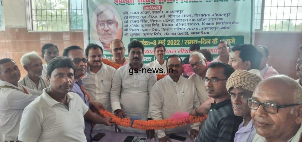 जनता दल यूनाइटेड संगठन जिला नवगछिया का संगठन विस्तार के लिए समीक्षा बैठक नवगछिया के गोपाल गौशाला में आयोजित हुई। बैठक की अध्यक्षता जिलाध्यक्ष विरेंद्र कुमार सिंह कुशवाहा और संचालन वरिष्ठ नेता शमीम मुन्ना ने किया। बैठक के मुख्य अतिथि गोपालपुर विधानसभा के विधायक नरेंद्र कुमार नीरज उर्फ गोपाल मंडल और पार्टी के प्रदेश सचिव सह नवगछिया संगठन प्रभारी सुनील कुमार सिंह थे। विधायक गोपाल मंडल ने कहा कि नीतिश के नीति, सिद्धांत और कामों का प्रचार प्रसार करने से ही संगठन का विस्तार होगा। राजनीति रोजगार नहीं समाज सेवा है इसलिए अपना काम धंधा करते हुए संगठन के प्रति समर्पित रहें। संगठन प्रभारी सुनील सिंह ने कहा की संगठन के सभी साथियों के सहयोग से 10 दिनों के अंदर में प्रत्येक गांव में 10-10 नए साथियों को संगठन से जोड़ना है। पार्टी के मुख्य प्रवक्ता रवि कुमार ने बताया कि 12 मई को इस्माइलपुर, 14 मई को नारायणपुर और 15 मई को बिहपुर, खरीक, गोपालपुर, नवगछिया व रंगरा प्रखंड में संगठन विस्तार हेतु बैठक होगी। मौके पर खगड़िया के वरिष्ठ नेता सुबोध यादव,अजय , पप्पू यादव,अखिलेश सिंह निषाद, जितेंद्र साहू, अमर कुमार सिंह, पारसनाथ साहू,भवेश यादव, पुष्पक सिंह, शिवशंकर चौधरी, जयनारायण पासवान, त्रिपुरारी भारती, अरुण पोद्दार, रंजीत मंडल, वकील मंडल, शैलेंद्र ठाकुर, मु. शाहिद राजा, साकेत बिहारी, ललन महतो, मुरारी मंडल, ज्ञानशक सिंह, अनिल पटेल, हरशंभू सिंह, हुलाश सिंह, मनोज लाल, अनिल पटेल,चंद्रिका मंडल,राजनीति तांती, नीलाभ चौधरी, नवीन निश्चल, अमन कुमार आनंद,विजय सिंह, वकील पासवान,अनीता देवी, सुषमा देवी, राज कुमारी, राज नंदनी,हिना खातून व अन्य मौजूद थे।