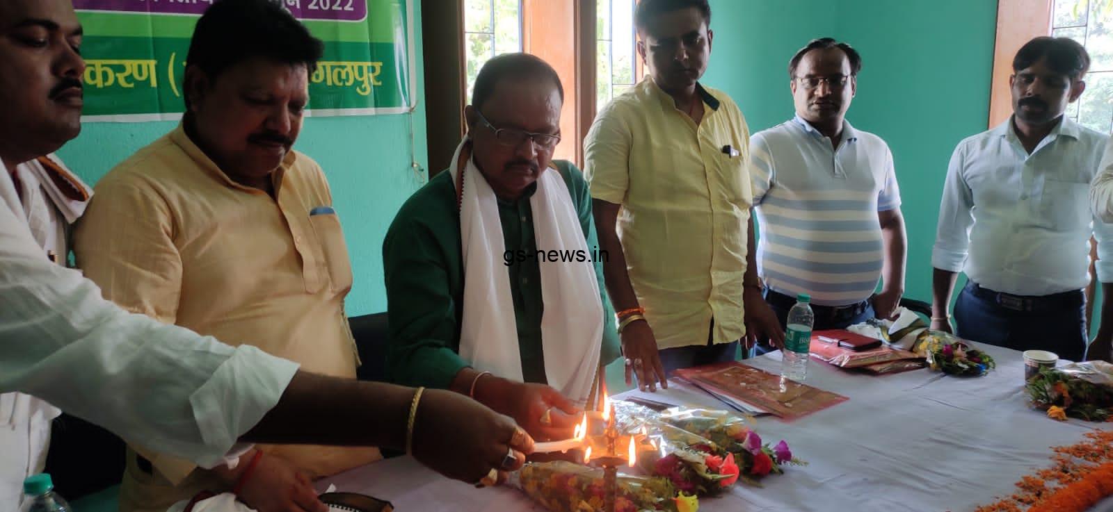 नवगछिया प्रखंड अन्तर्गत ई–किसान भवन में शुक्रवार को खरीफ महाभियान 2022 के अन्तर्गत प्रखंड स्तरीय प्रशिक्षण-सह-उपादान वितरण कार्यक्रम का उदघाटन गोपालपुर विधानसभा क्षेत्र के विधायक नरेन्द्र कुमार नीरज उर्फ गोपाल मंडल द्वारा दीप प्रजवलित कर किया गया. इस अवसर पर पूर्व प्रमुख मानकेश्वर सिंह, उप–प्रमुख गौतम कुमार, सहायक कृषि अभियंत्रण भागलपुर, कृषि वैज्ञानिक सबौर भागलपुर,