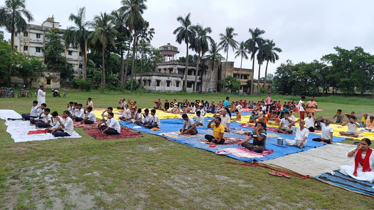 चैत्रावली दुर्गा स्थान में योग शिविर में योग करते लोग