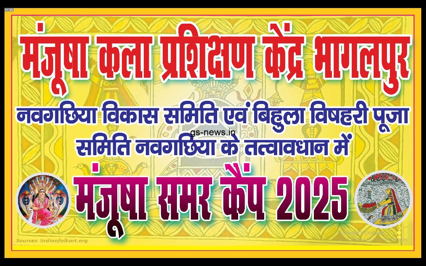 नवगछिया में बुधवार से छह दिवसीय मंजूषा समर कैंप का आयोजन मंजूषा प्रशिक्षण केंद्र एवं बिहुला विषहरी पूजा समिति के तत्वावधान में किया जाएगा। समिति के संयोजक मुकेश राणा ने बताया कि इस कैंप में बच्चों को मंजूषा पेंटिंग का प्रशिक्षण मंजूषा कलाकार अश्विनी आनंद और खुशी श्री द्वारा दिया जाएगा।