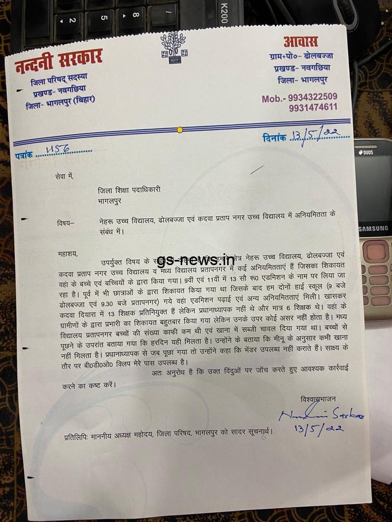 जिला परिषद नंदनी सरकार नें उच्च विद्यालय में अनियमितता को लेकर जिला पदाधिकारी से शिकायत की हैं। जिला परिषद ने बताया कि नेहरू उच्च विद्यालय ढोलबज्जा, कदवा प्रताप नगर उच्च विद्यालय में अनियमितता हैं। वर्ग नो एवं 11 में नामंकन के लिए 13 सौ रूपया लिया जा रहा हैं। पूर्व में भी छात्र छात्राओं ने नामंकन में अधिक रूपये लेने की शिकायत किया था। शिकायत करने के बावजूद कोई कार्रवाई नहीं हुई।