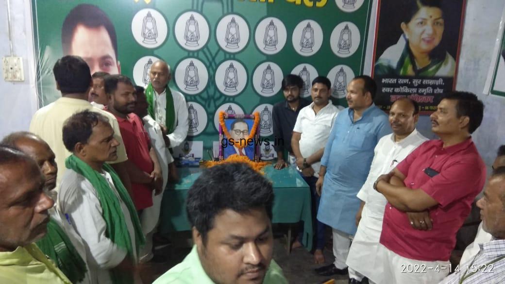 नवगछिया राजद कार्यालय में संविधान निर्माता डॉ भीमराव अंबेडकर के जंयती पर गुरुवार को राजद कार्यालय में राजद नेताओं ने उनके तैलीय चित्र पर माल्यार्पण कर पदचिन्हों पर चलने के लिए संकल्पित हुए कार्यक्रम की अध्यक्षता जिलाध्यक्ष अलखनिरंजन पासवान एवं युवा राजद जिलाध्यक्ष कान्तेश कुमार उर्फ टीनू ने संयुक्त रूप से किया एवं कार्यक्रम का संचालन युवा राजद प्रवक्ता शुभम यादव ने किया मुख्य अतिथि के रूप में गोपालपुर विधानसभा के पूर्व प्रत्याशी शैलेश कुमार ने उनके तैलीय चित्र पर माल्यार्पण कर श्रद्धांजलि अर्पित किया तत्पश्चात राजद नेताओं एवं वक्ताओं द्वारा कार्यक्रम को संबोधित किया गया .