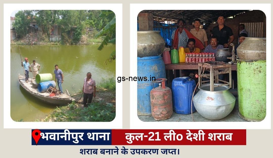 नारायणपुर के मनोहरपुर गांव के पास बने बासा से भवानीपुर पुलिस ने गुप्त सूचना पर रविवार को शराब बनाने वाली भट्ठी का उद्भेदन किया.थानाध्यक्ष इंस्पेक्टर महेश कुमार ने बताया कि गुप्त सूचना पर कार्रवाई की गयी है.21.25 लीटर देशी शराब व चार सौ लीटर अर्द्ध निर्मित शराब व शराब निर्माण की भट्ठी से संबंधित सभी उपकरण बरामद किया गया है. अर्द्ध निर्मित शराब को विनिष्ट कर दिया गया है. दोषियों पर मद्य निषेध अधिनियम के तहत प्राथमिकी दर्ज करने की प्रक्रिया की जा रही है.