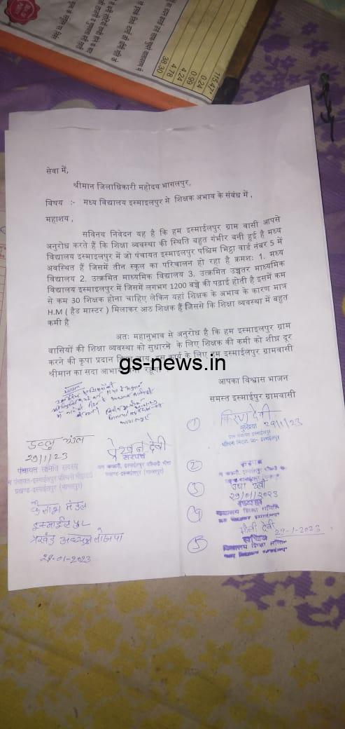 भागलपुर जिला अन्तर्गत इस्माईलपुर प्रखंड स्थित उत्क्रमित मध्य विद्यालय में पढ़ाई शून्य के बराबर हो रही है। इसी बाबत ग्रामीणों ने भागलपुर जिला अधिकारी को एक लिखित आवेदन देकर इस विद्यालय की स्थिति से अवगत कराया। इस विद्यालय के प्रधानाध्यापक ब्रह्मदेव रविदास ने कहा कि इस विद्यालय में कुल 1300 छात्र छात्राएँ नामांकित हैं और शिक्षक केवल 8 ऐसे में गुणवत्ता पूर्ण पठन पाठन असंभव है।