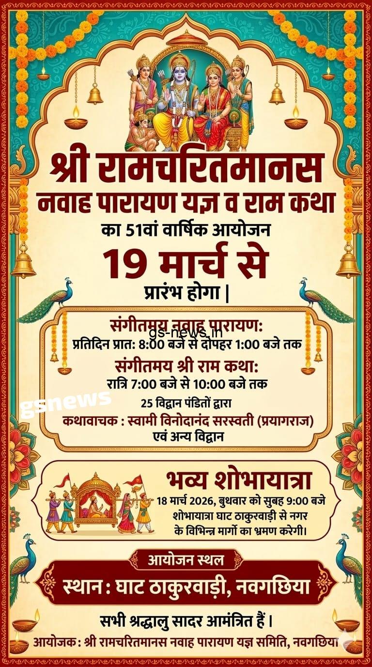 नवगछिया में श्री रामचरितमानस नवाह पारायण यज्ञ समिति के तत्वावधान में हर वर्ष की भांति इस वर्ष भी श्री रामचरितमानस नवाह पारायण यज्ञ एवं श्री राम कथा के अमृत वर्षा का 51वां वार्षिक आयोजन 19 मार्च 2026, गुरुवार से प्रारंभ होगा। यह धार्मिक आयोजन 27 मार्च 2026 तक घाट ठाकुरवाड़ी, नवगछिया में बड़े ही धूमधाम और भक्ति भाव के साथ संपन्न किया जाएगा।