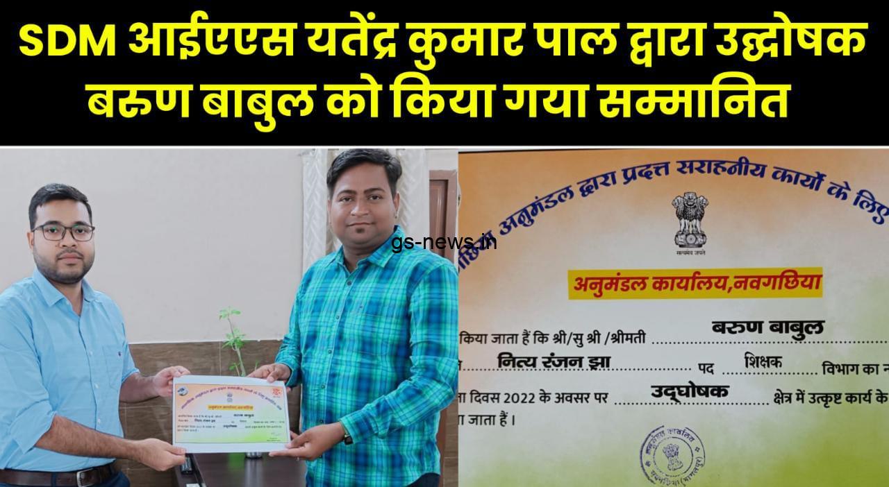 नवगछिया – आजादी के अमृत महोत्सव पर नवगछिया अनुमंडल के मंच पर स्वतंत्रता दिवस समारोह 2022 में उत्कृष्ठ प्रस्तुति पर नवगछिया एसडीओ आईएएस यतेंद्र कुमार पाल नें शिक्षक सह उद्घोषक बरुण बाबुल को अनुमंडल प्रशस्ति पत्र से सम्मानित किया गया. यह सम्मान एसडीओ के कक्ष में प्रदान किया गया. मौके पर उन्होंने उद्घोषक बरुण बाबुल की उज्ज्वल भविष्य की कामना करते हुए धन्यवाद बधाई दी.