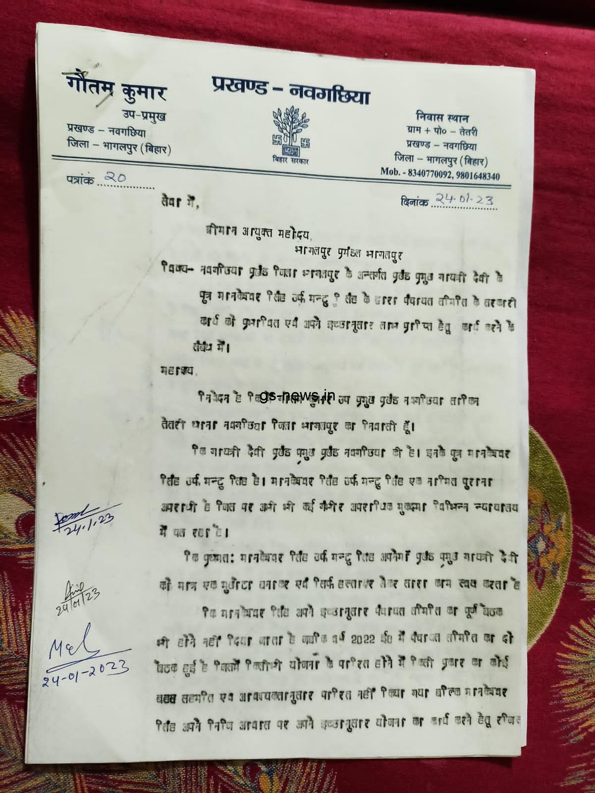 नवगछिया – नवगछिया प्रखंड उपप्रमुख गौतम कुमार ने भागलपुर जिला अधिकारी को आवेदन देकर प्रखंड प्रमुख पुत्र सह पूर्व प्रमुख मानिकेश्वर सिंह पर पंचायत समिति की बैठक में मनमाने तरीके से बैठक में घुसने, पंचायत के कार्यों में हस्तक्षेप करने साथ ही कई योजनाओं में मनमाना तरीके से कार्य करने की शिकायत की है. अपने आवेदन में गौतम कुमार ने कहा है कि बैठक के दौरान प्रमुख पुत्र हथियार के साथ बैठक कक्ष में घुस जाते हैं और कार्यपालक पदाधिकारी से मनमाने तरीके से कार्य करवाते हैं. इन सभी मामलों को लेकर कार्रवाई करने की मांग की है. साथ ही साथ आयुक्त और पंचायती राज पदाधिकारी को भी आवेदन दिया गया है.