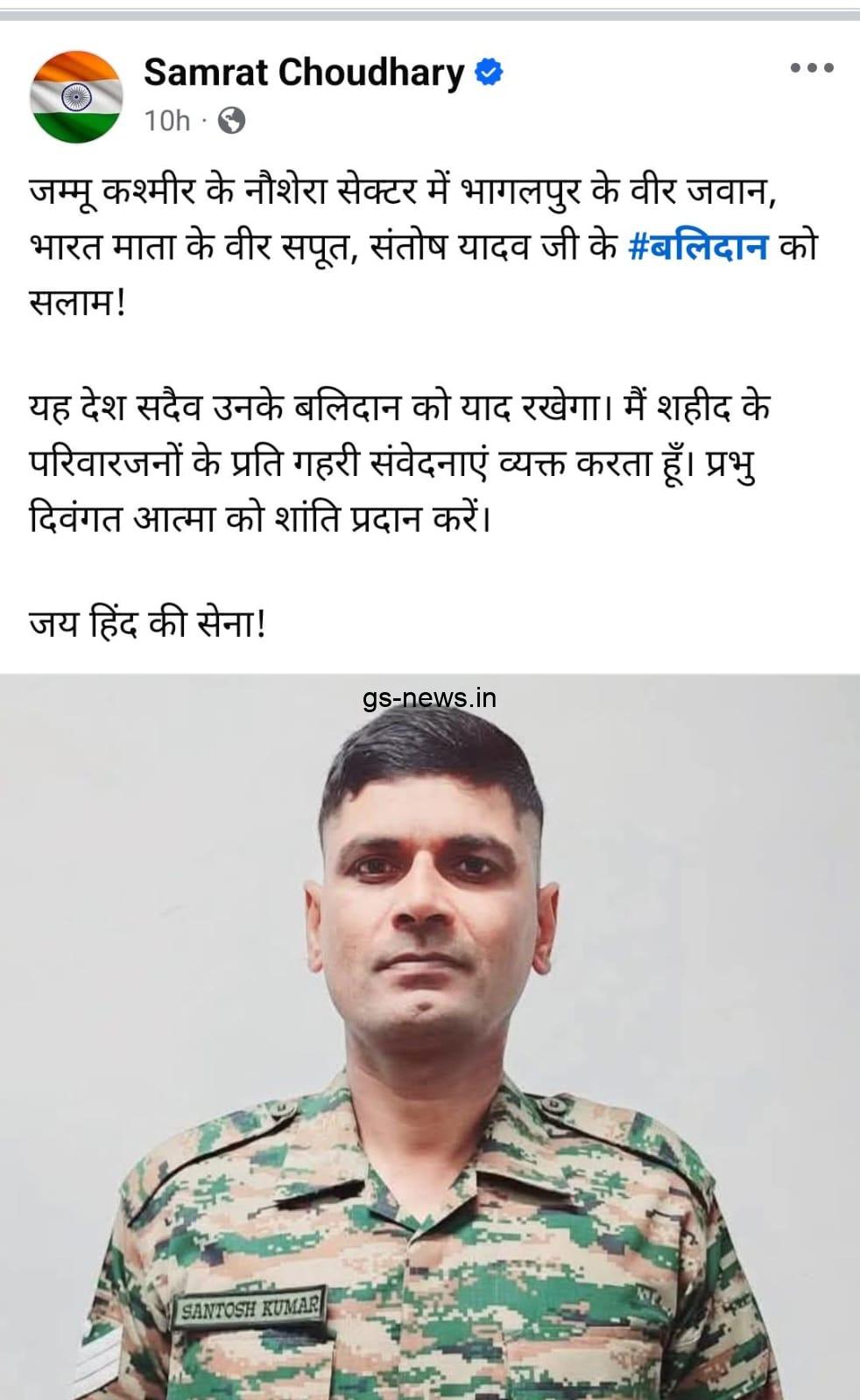 भागलपुर: उपमुख्यमंत्री सम्राट चौधरी ने अपने सोशल मीडिया अकाउंट पर पोस्ट करते हुए जम्मू कश्मीर के नौशेरा सेक्टर में शहीद हुए संतोष यादव को श्रद्धांजलि अर्पित की. सम्राट चौधरी ने बताया कि नवगछिया अनुमंडल के इस्माइलपुर प्रखंड के पछियाड़ी टोला भीठ्ठा गांव निवासी वीर जवान, भारत माता के सपूत संतोष यादव के बलिदान को सलाम!