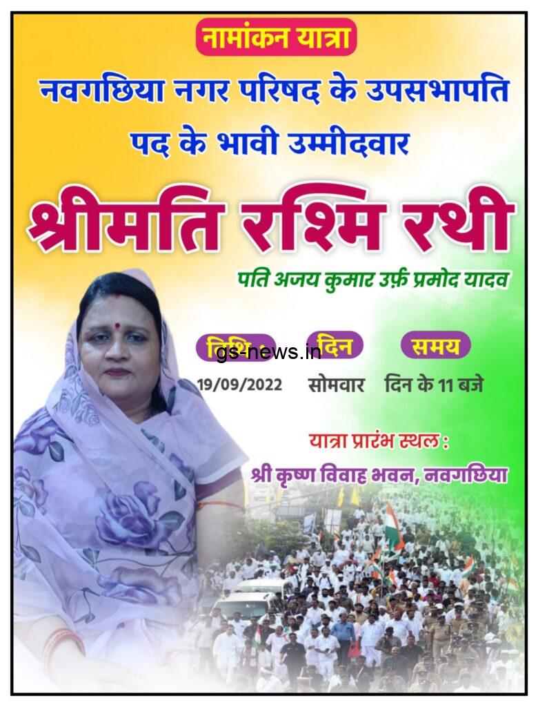 नवगछिया के राजनीति में कायम स्थापित करने वाले पूर्व उपाध्यक्ष कृष्ण देव यादव उर्फ केडी यादव की पुत्र वधू एवं पूर्व वार्ड पार्षद अजय कुमार उर्फ प्रमोद यादव की पत्नी रश्मि रथी आज सोमवार 19 सितंबर को नवगछिया नगर परिषद के उपसभापति पद पर अपना नामांकन दाखिल करेंगीं । इस बाबत अजय कुमार उर्फ़ प्रमोद यादव ने जीएस न्यूज़ को बताया कि पहले उनका और उनके समर्थकों का विचार सभापति पद पर नामांकन को लेकर था ।