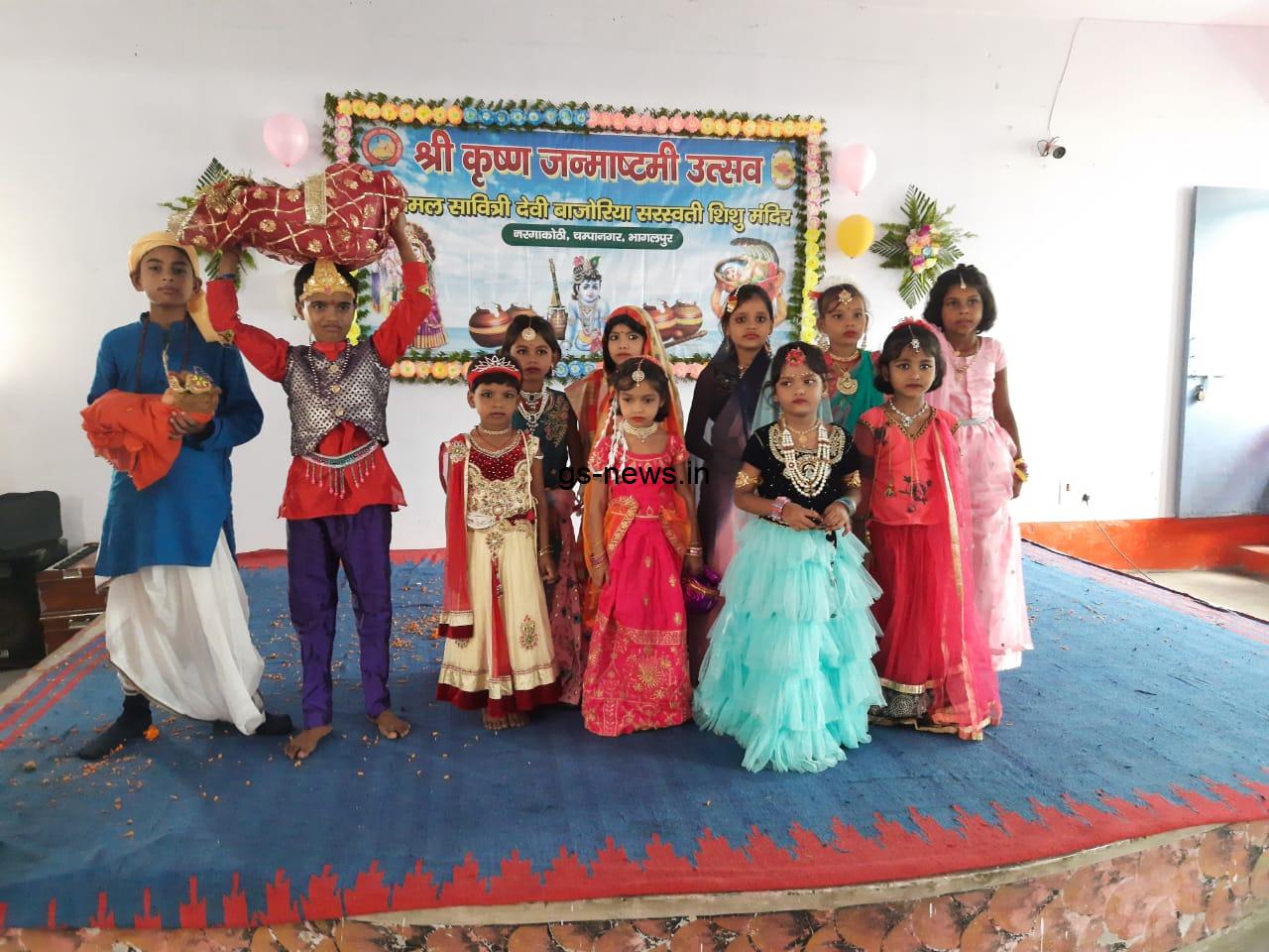 दिनांक 17 अगस्त 2022 दिन बुधवार को पूरनमल सावित्री देवी बाजोरिया सरस्वती शिशु मंदिर नरगा कोठी चंपानगर के विशाल सभागार में भैया बहनों द्वारा श्री कृष्ण जन्माष्टमी उत्सव मनाया गया। कार्यक्रम में कक्षा अरुण से पंचम तक के भैया बहनों ने भाग लिया। कार्यक्रम का प्रारंभ विद्यालय के सचिव उपेंद्र रजक, प्रधानाचार्य नीरज कुमार कौशिक, प्रभारी प्रधानाचार्य जितेंद्र प्रसाद द्वारा संयुक्त रूप से दीप प्रज्वलित किया गया।
