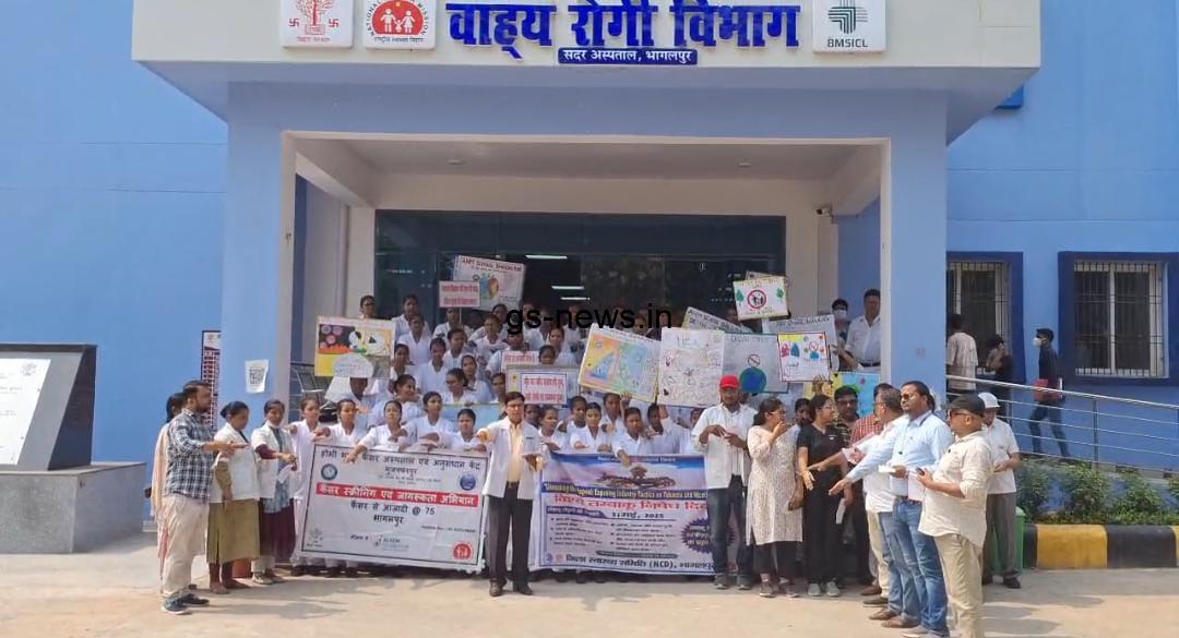 भागलपुर : विश्व तंबाकू निषेध दिवस के अवसर पर शनिवार सुबह भागलपुर के सदर अस्पताल से डॉक्टरों और स्वास्थ्यकर्मियों ने प्रभात फेरी निकाल कर लोगों को तंबाकू के दुष्परिणामों के प्रति जागरूक किया। इस रैली में अस्पताल के दर्जनों डॉक्टर, नर्सें, एएनएम सहित स्वास्थ्यकर्मी शामिल हुए।