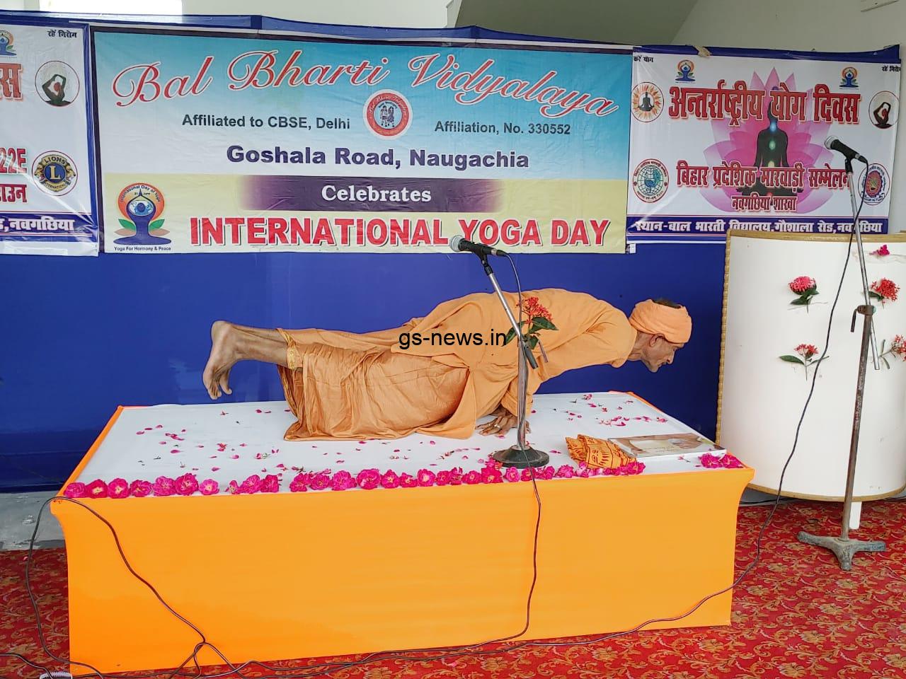 बाल भारती गौशाला रोड में बिहार प्रादेशिक मारवाड़ी सम्मेलन नवगछिया शाखा, लायंस क्लब ऑफ नवगछिया टाउन के संयुक्त तत्वाधान में अष्टम अंतरराष्ट्रीय योग दिवस बड़े ही उत्साह के साथ मनाया गया. बाल भारती विद्यालय प्रबंधन समिति के अध्यक्ष पवन कुमार सर्राफ, उपाध्यक्ष अजय कुमार रुंगटा, डॉ बीएल चौधरी, डॉ अशोक केजरीवाल, लायंस क्लब ऑफ नवगछिया टाउन के अध्यक्ष कमलेश अग्रवाल, बिहार प्रादेशिक मारवाड़ी सम्मेलन नवगछिया शाखा के सचिव विनोद केजरीवाल, बालकृष्ण पंसारी, विद्यालय के प्राचार्य नवनीत सिंह ने दीप प्रज्वलित कर कार्यक्रम की शुरुआत की. योग गुरु राजीव मिश्रा के नेतृत्व में सभी लोगों ने योग का अभ्यास किया. इस अवसर पर विद्यालय प्रबंधन समिति के न्यासी अमरचंद टिबरेवाल, भगवती पंसारी, विद्यालय प्रबंधन समिति के कोषाध्यक्ष अभय मुनका ,लायंस क्लब के सचिव सुभाष वर्मा, विनोद चिरानिया, पप्पू चिरानिया, एवं शहर के बहुत सारे गणमान्य व्यक्ति उपस्थित थे.